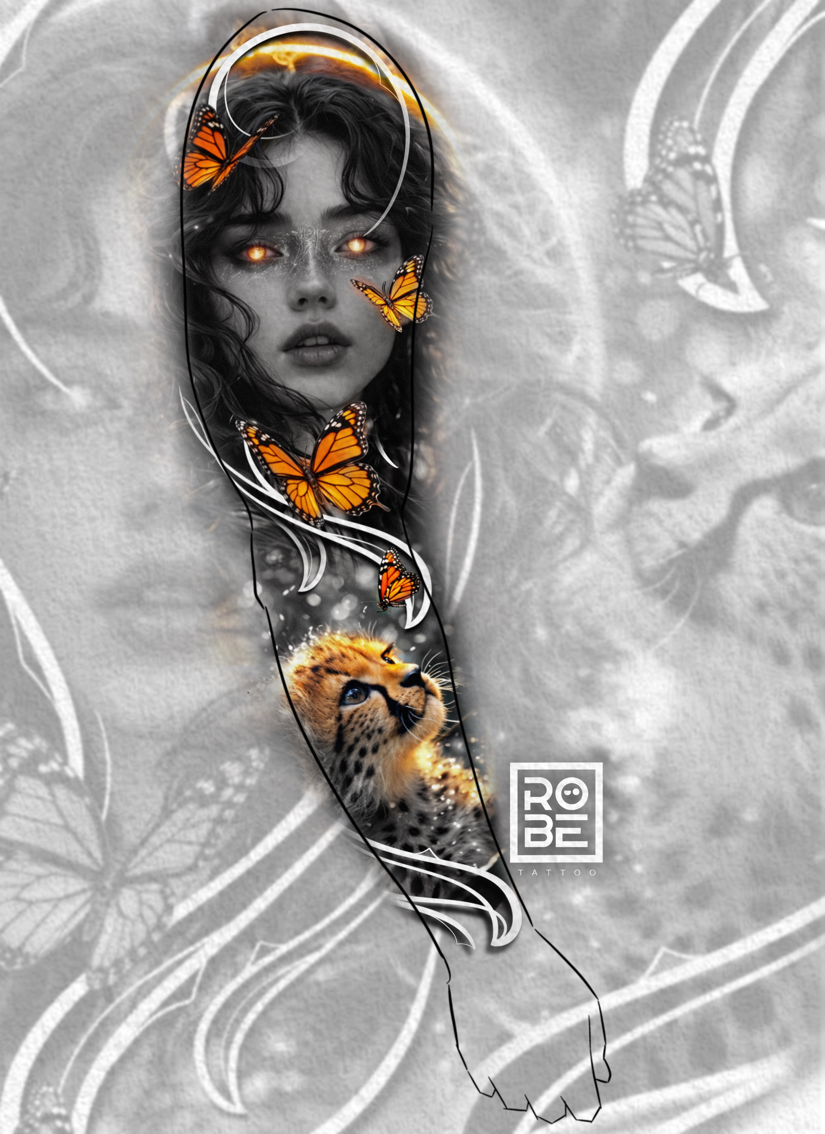 Symbolizes beauty in evolution. Butterflies represent transformation, the cheetah embodies instinct and purity, and the woman reflects divine feminine energy. A balance between grace and natural strength.