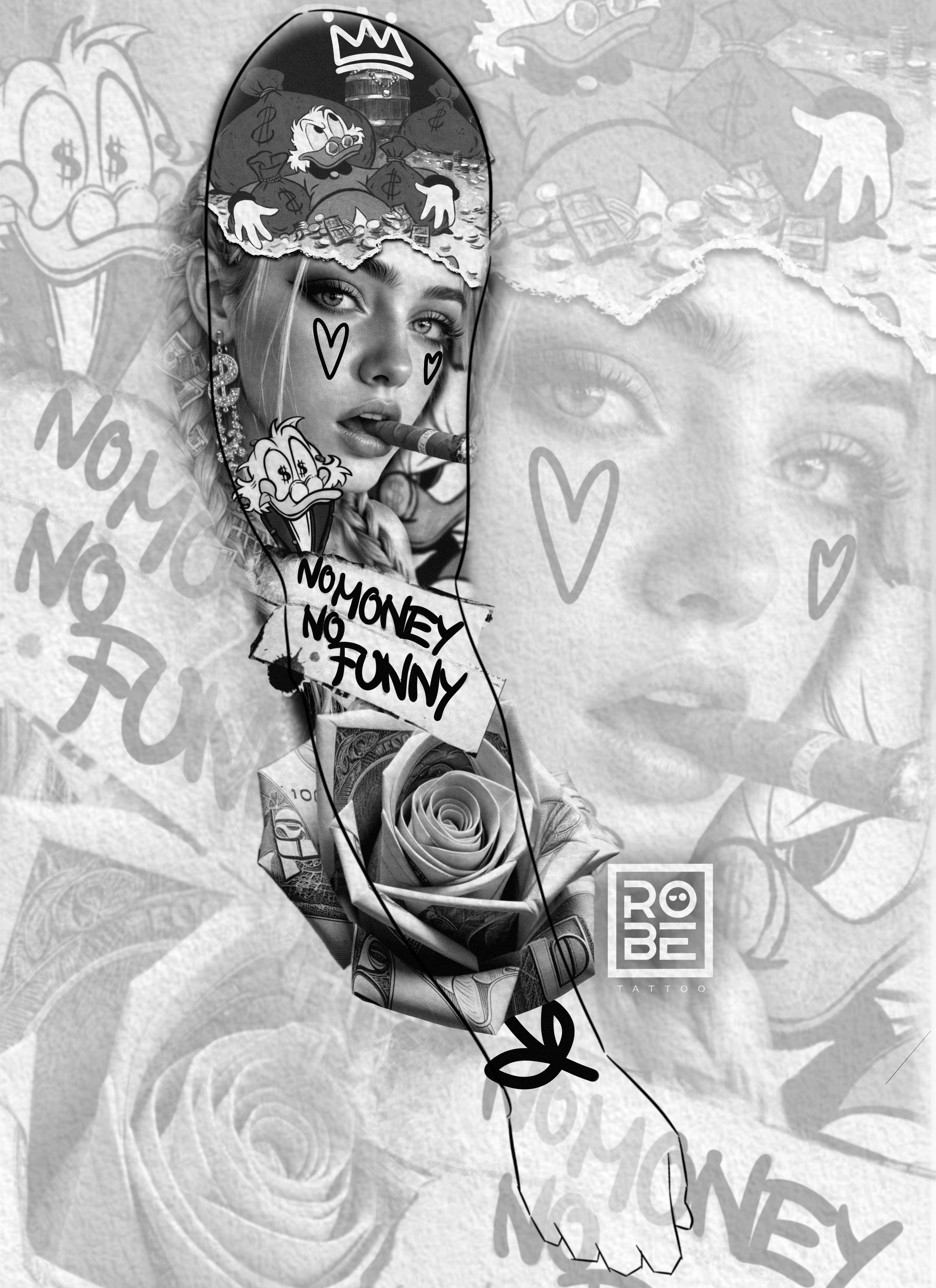 A seductive female portrait combined with a bold chicano graffiti-style composition, featuring money elements, a “Rich” concept, and a dollar rose.