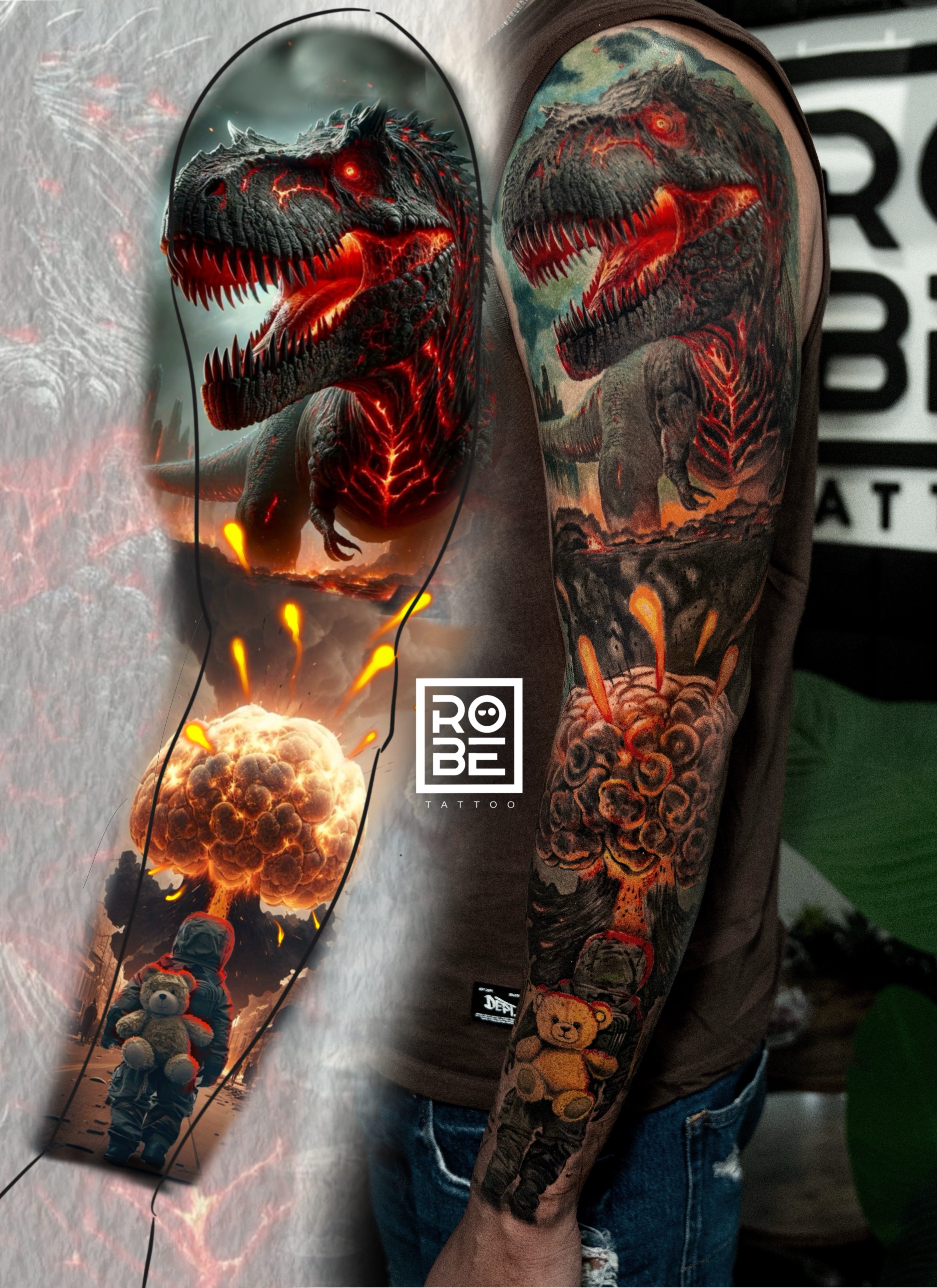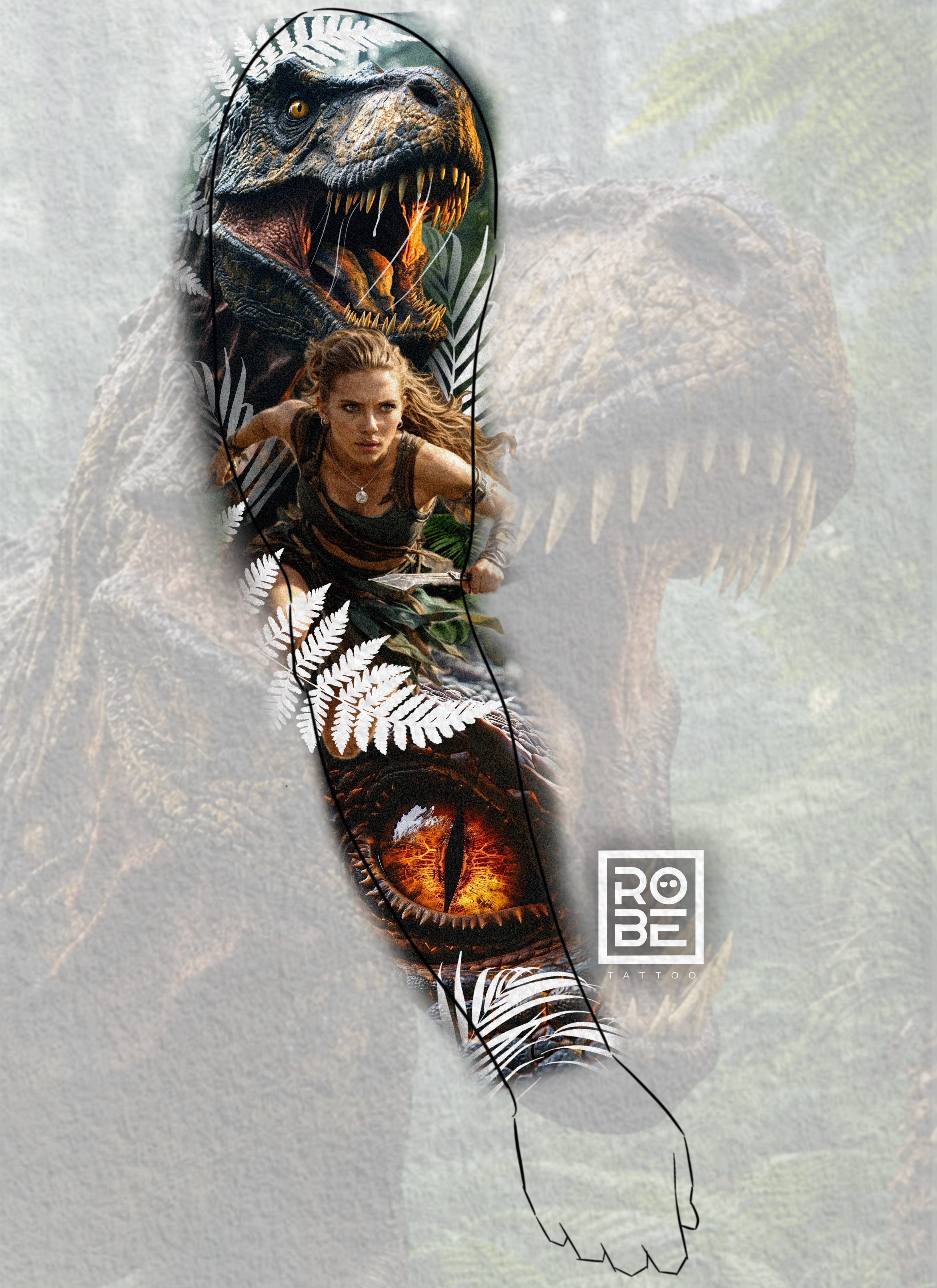 A cinematic composition inspired by Jurassic World, featuring a woman resembling Scarlett Johansson, a powerful T-Rex, and a piercing red dinosaur eye dominating the forearm.Symbolizes survival, instinct, and dominance. The human figure represents intelligence, while the dinosaur reflects primal power. The red eye embodies awareness, danger, and the raw nature of existence.