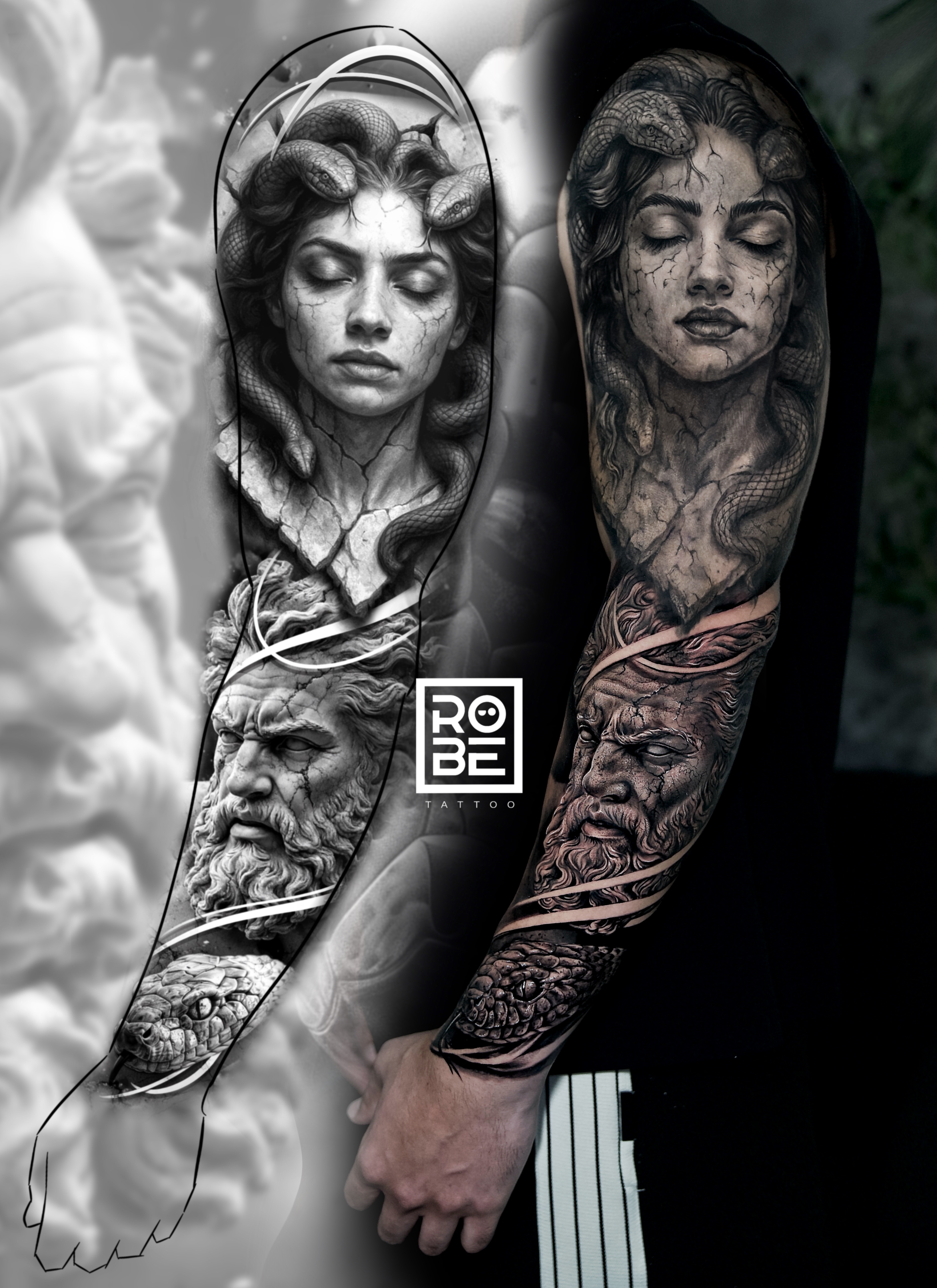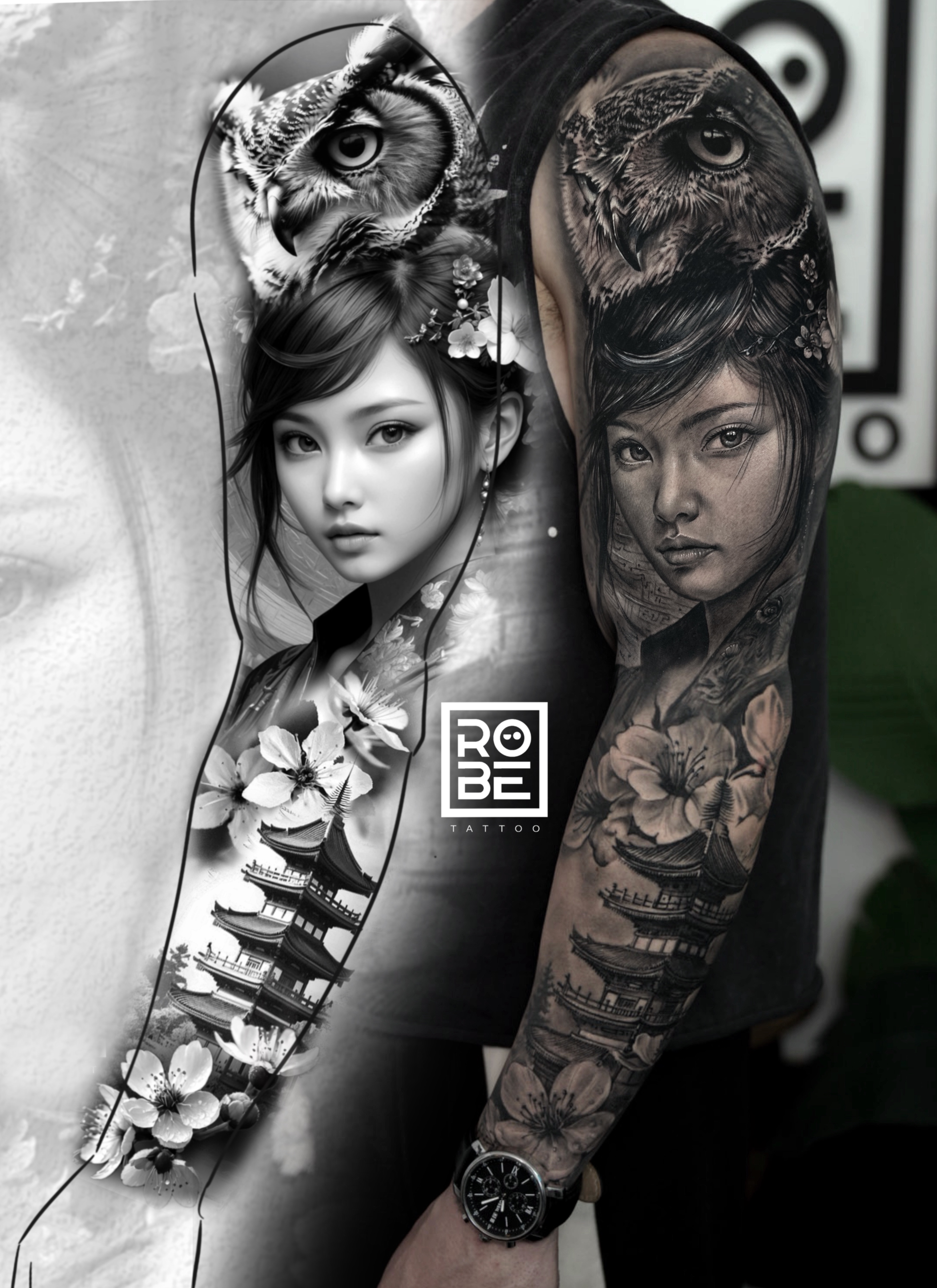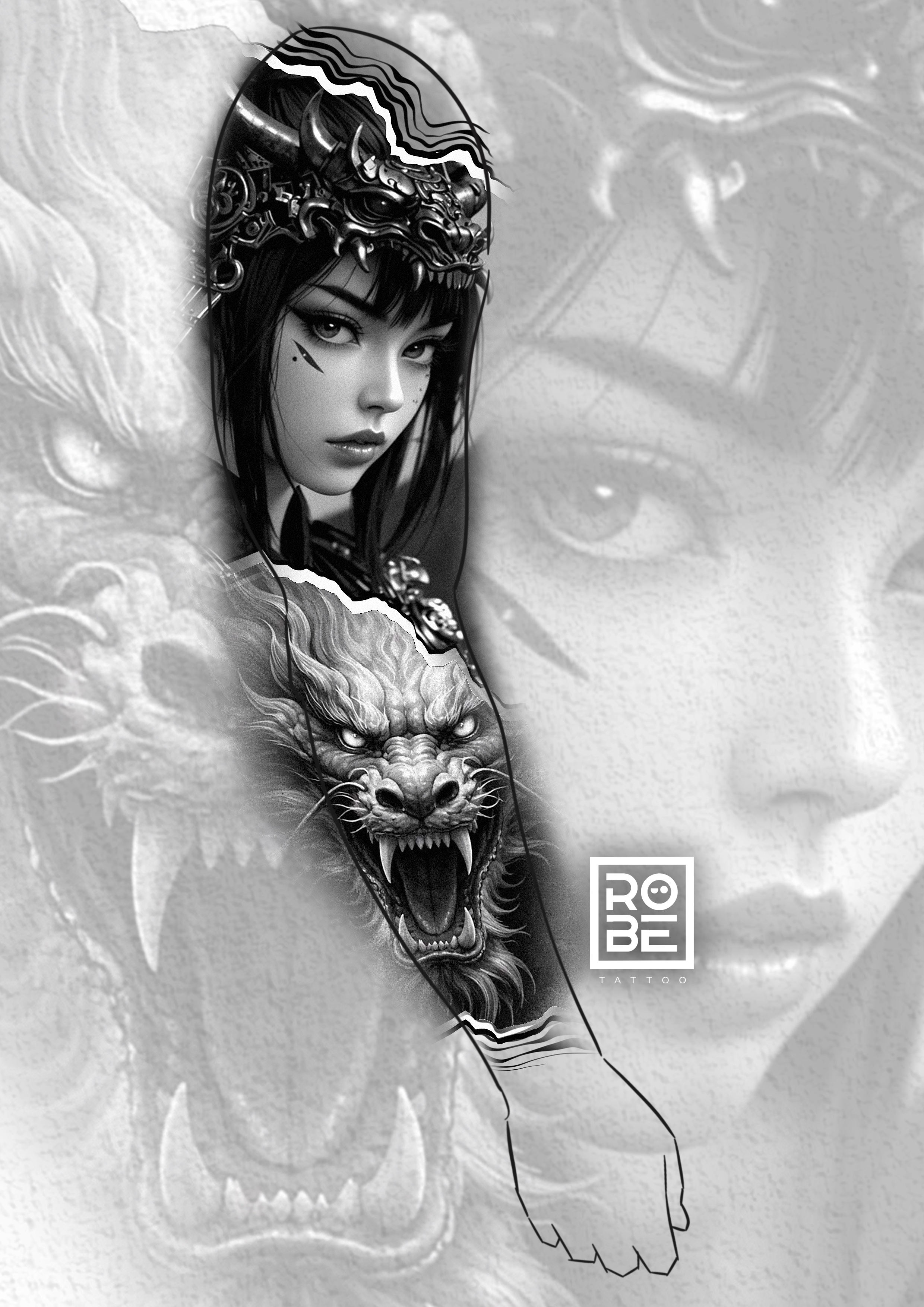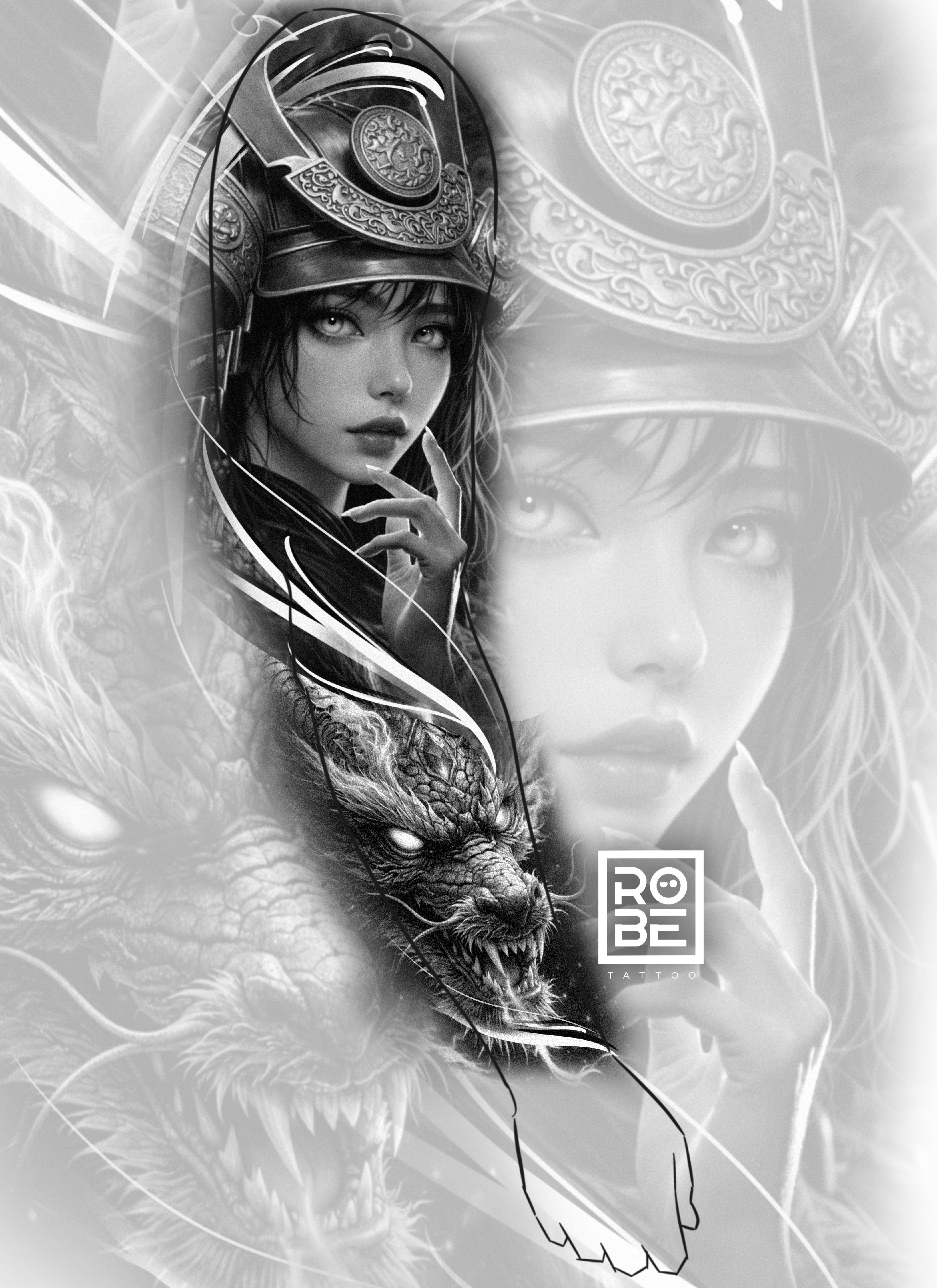 A Black & Grey realism sleeve where a samurai geisha dominates the upper arm, representing discipline, honor, and control, while on the forearm emerges the face of a realistic Japanese dragon, symbolizing power, wisdom, and evolution. Negative filigree elements connect both forces, creating a harmonious flow that expresses the duality of a man: a serene mind and an indomitable spirit.