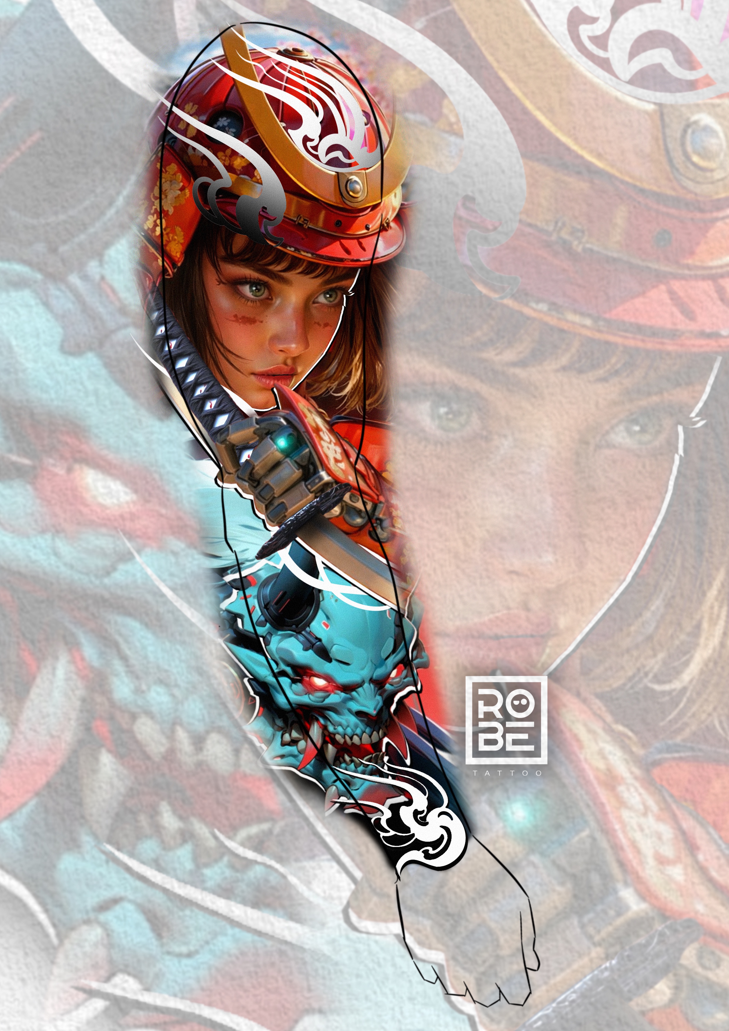 Represents the fusion between human evolution and inner darkness. The samurai symbolizes discipline, while the robotic demon reflects the hidden power within. A balance between control and chaos in a modern world.