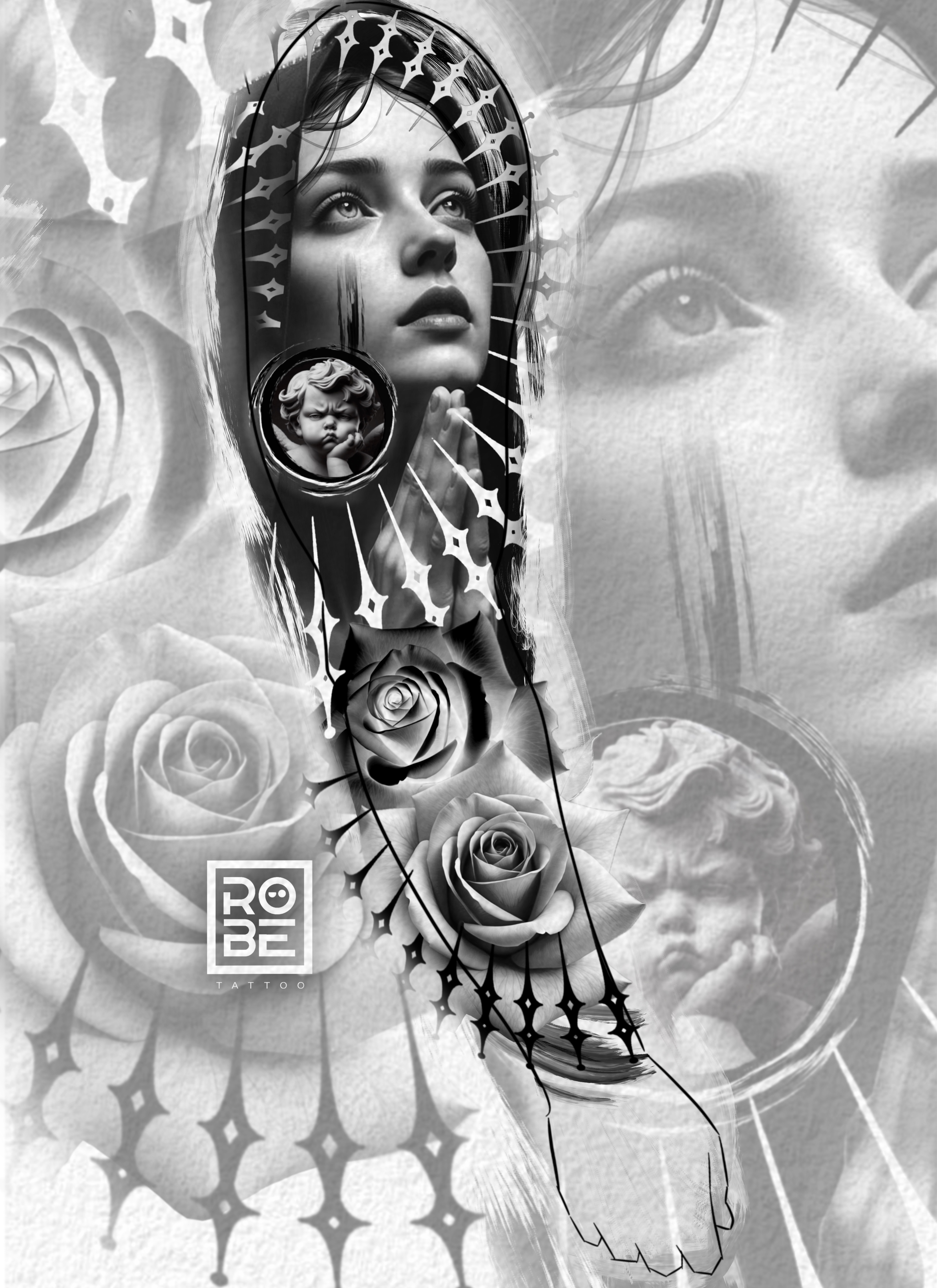 Symbolizes divine protection through dual forces: purity and strength. The Virgin represents faith and guidance, the angel embodies defense and justice, and the roses reflect life’s duality—light and shadow, visible and hidden.
